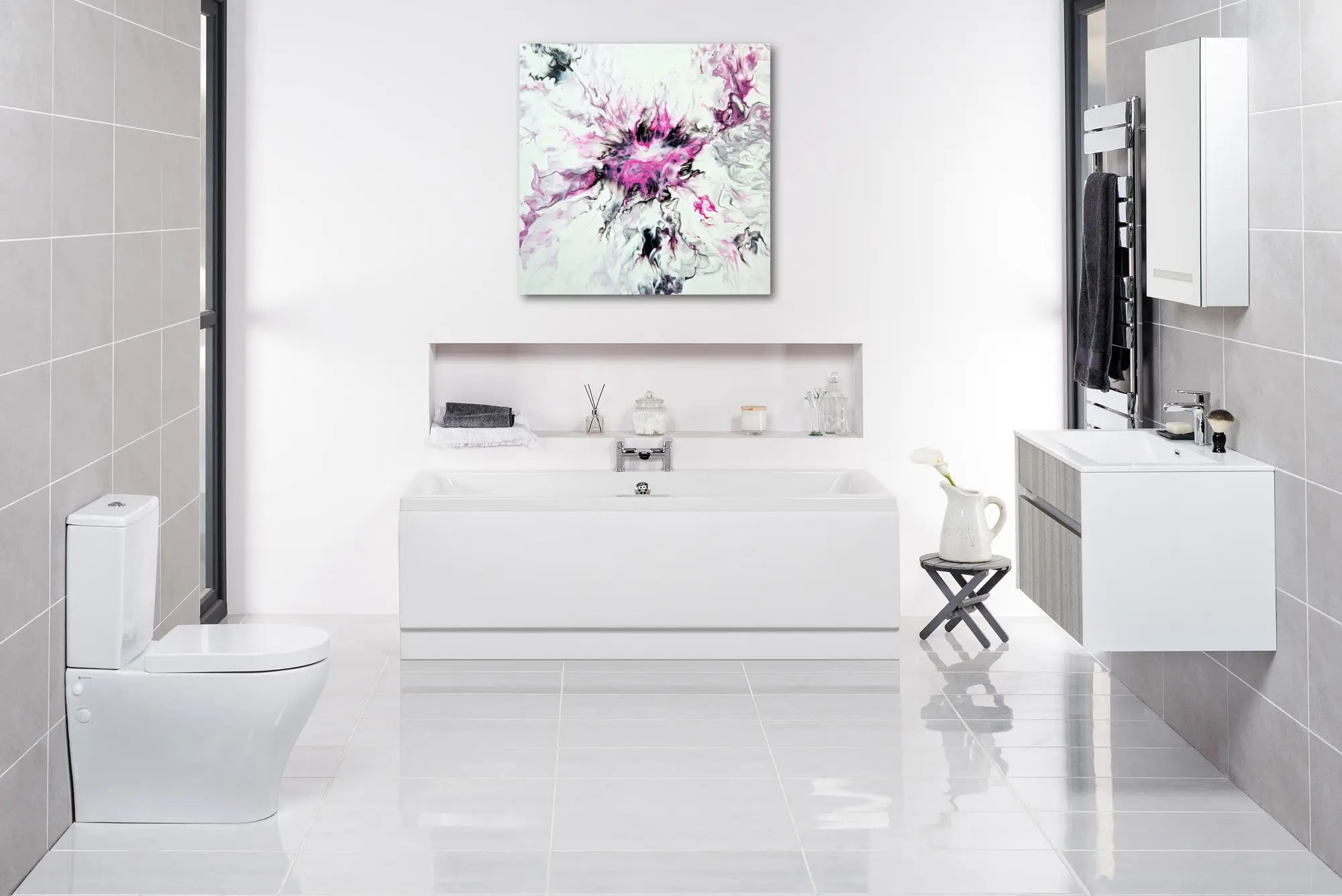 Niesłychanie kobiecy obraz abstrakcyjny „Blow Your Mind” rozpali Twoje zmysły i przeniesie Cię do świata pasji i piękna. Podkreśli nowoczesny styl i niepowtarzalny charakter Twojego wnętrza. Wybuchowa mieszanka elektryzującego różu, srebra i głębokiej czerni sprawi, że Twoja dusza rozpłynie się w namiętności i pożądaniu.