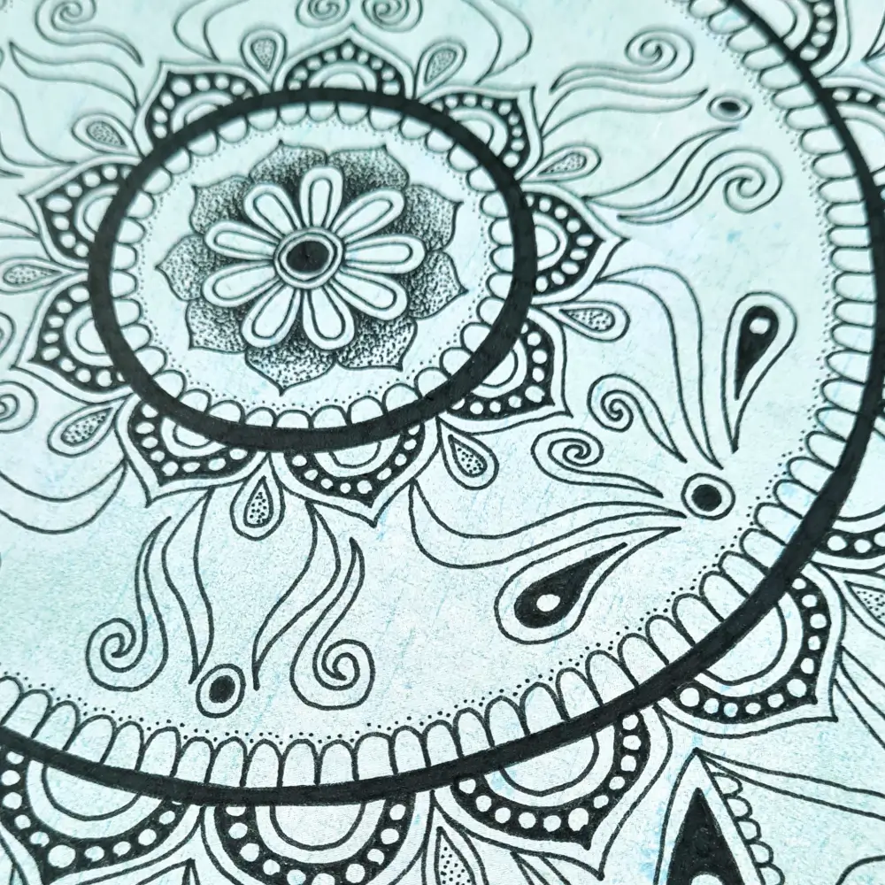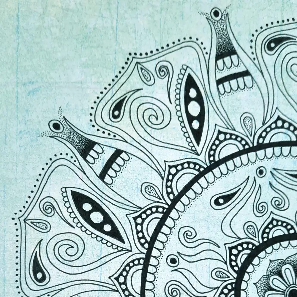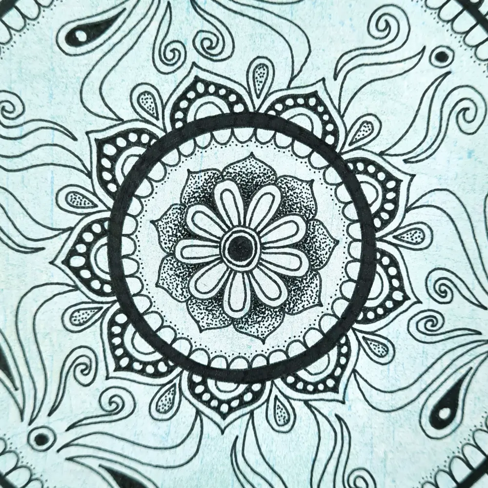 Wyjątkowa mandala, utrzymana w delikatnych odcieniach morskiego błękitu, łączy w sobie subtelność i harmonię. Symetryczne ornamenty i misterne detale wprowadzą do Twojej przestrzeni atmosferę spokoju, równowagi i artystycznej finezji. Czarny wzór na teksturowanym tle nadaje mandali głębię i unikalny charakter.