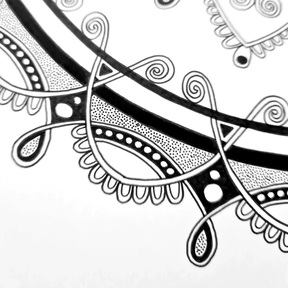 Minimalistyczna, a jednocześnie bogata w detale mandala w czerni i bieli to idealna dekoracja dla miłośników sztuki, równowagi i symetrii. Jej precyzyjne wzory przyciągają wzrok i wprowadzają do wnętrza atmosferę spokoju oraz medytacyjnej harmonii. Klasyczny kontrast i głębia wzoru czynią tę mandalę doskonałym wyborem do nowoczesnego i minimalistycznego wnętrza.